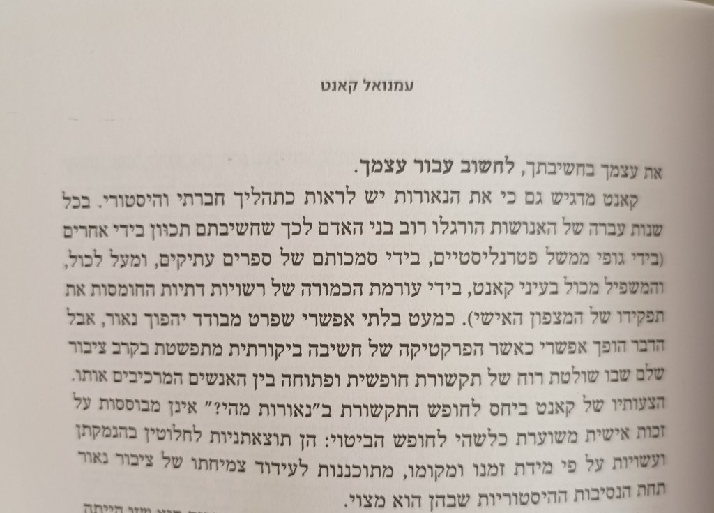 הראשון, מתוך ההקדמה, הוא על מאמרו 'הנאורות מהי', וכאן אביא דווקא את החלק השני של הנאמר, הפחות מוכר –