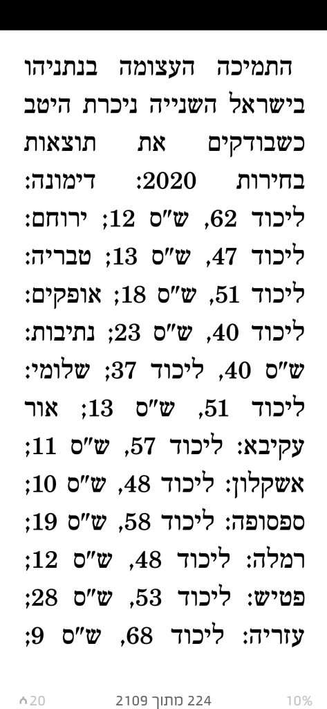 המשכתי קצת לקרוא בספרו של אבישי בן חיים, הספר מעניין וקולח, אך מסקנות אוכל לתת רק בסיום הקריאה. בינתיים, הנה מסד הנתונים, שמוכיח ש'ישראל השנייה', שאם אני מבין נכון היא בעיקר ישראל המזרחית (המושג לא מוגדר היטב, לדעתי, אולי אשאל אותו על כך) היא תומכת ליכוד-ימין-ביבי מובהקת –