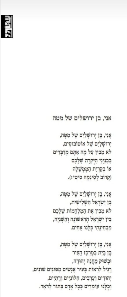 שלושה שירים שלי התפרסמו בעתון 77 האחרון. השלישי מזכיר את 'ישראל השנייה', המושג של אבישי בן חיים, אז שלחתי לו את השיר לראות מה תגובתו. האמת, הופתעתי. הייתי בטוח שהתגובה תהיה חיובית, אך היא לא הייתה כזאת. הוא נזף בי על שאני מכחיש דיכוי! זו האשמה חמורה בעיניי, ואיני מתעלם ממנה.
