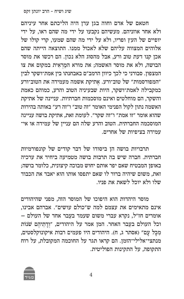 אבל עדיין אני מסכים עם עיקר דבריו של הרב זקס, והם גם רלוונטיים מאוד היום בדורנו, שכולו מתמקד בצד הבושה, ולכן נוצר שיח הרשתות הרעיל, ותופעת ה'שיימינג', הידועה לשמצה. וכזו היא גם הטלוויזיה, שביקורתי הנוקבת עליה ידועה, והיא הרי מדיום ויזואלי ביסודו.