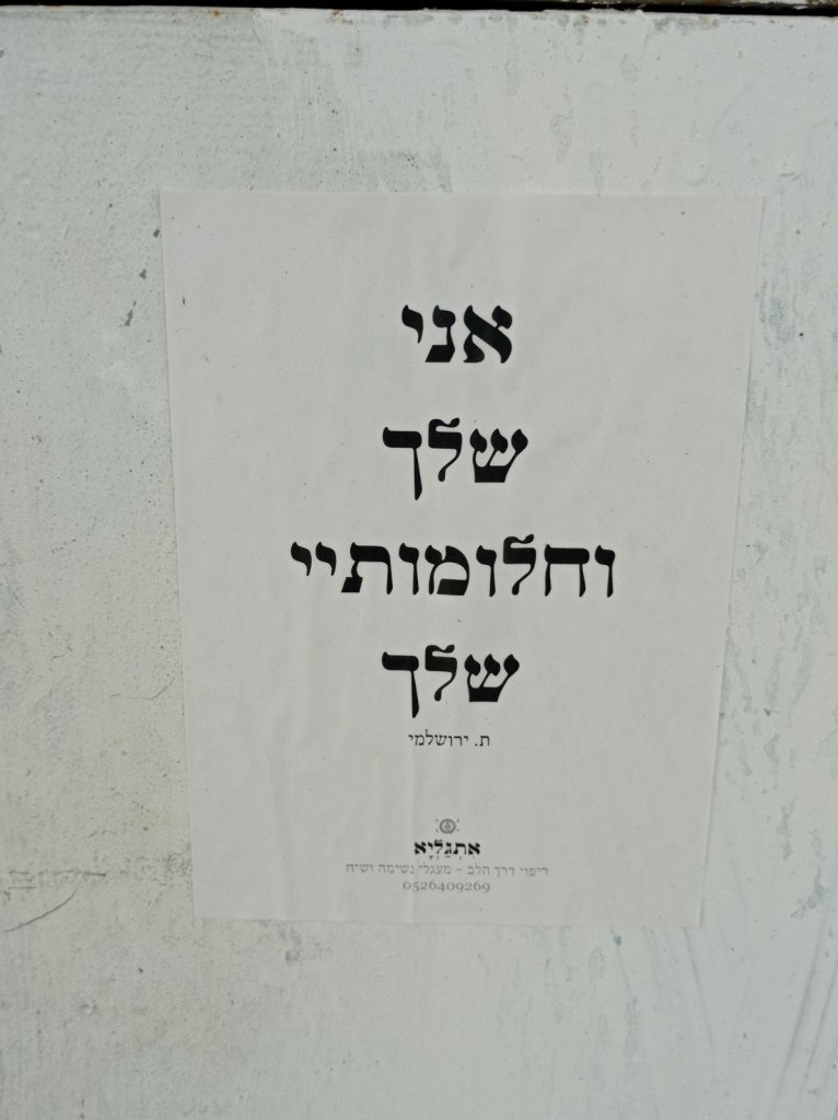 טיול בוקר בתמונות, 31.10.22 מוצאי בסמטת האהבה (רחוב שיריזלי, ירושלים) בסמטת האהבה כל תורת הצילום על רגל אחת. כֹּה אָמַר ה' צְבָאוֹת עֹד יֵשְׁבוּ זְקֵנִים וּזְקֵנוֹת בִּרְחֹבוֹת יְרוּשָׁלִָם וְאִישׁ מִשְׁעַנְתּוֹ בְּיָדוֹ מֵרֹב יָמִים.זכריה ח, ד. (מופיע מהסוף להתחלה, כלומר יש להתחיל מלמטה). שתף לחיצה לשיתוף ב-X (נפתח בחלון חדש) X לחיצה לשיתוף בפייסבוק (נפתח בחלון חדש) פייסבוק אהבתי טוען... קשור